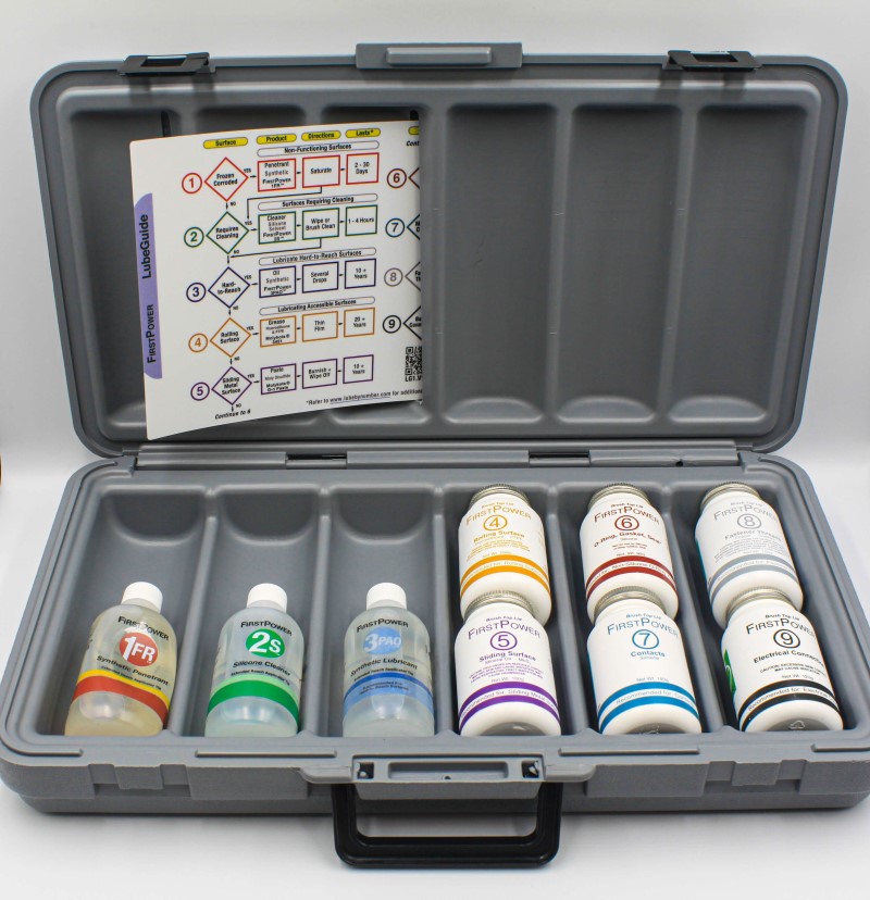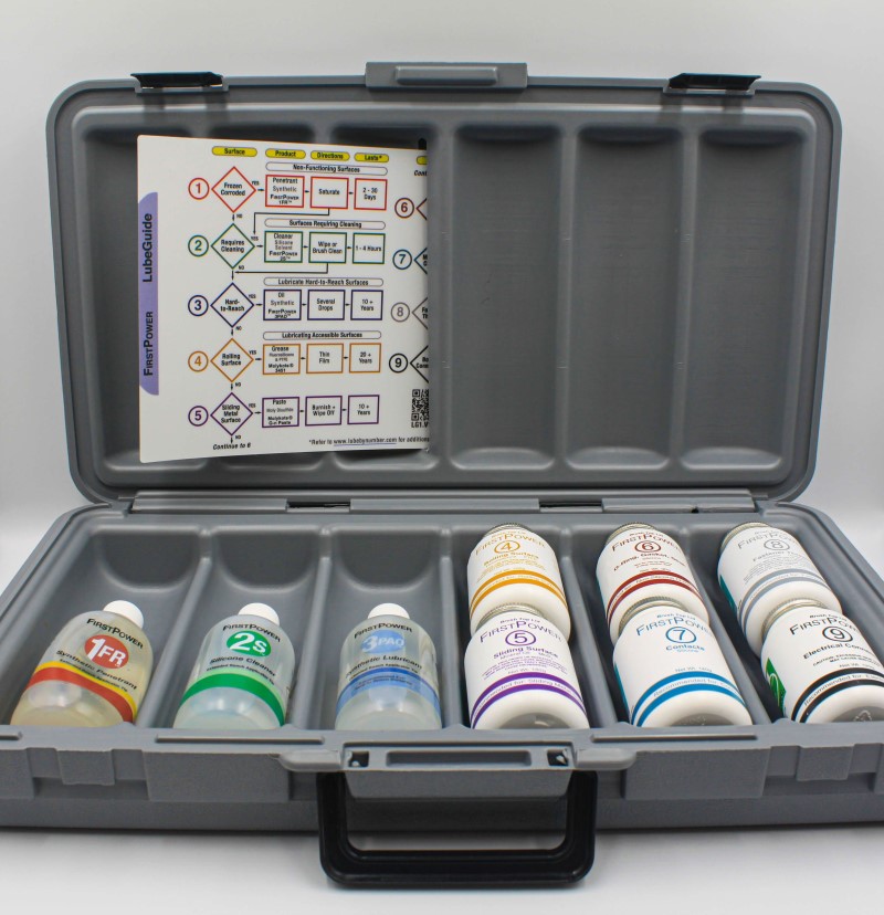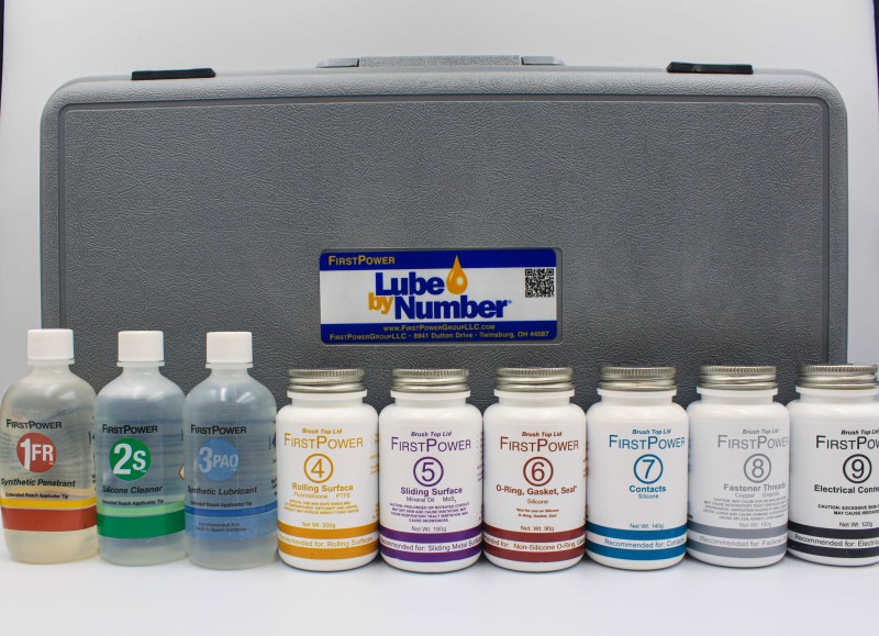 Lube by Number Kit The Lube by Number industrial lubrication kit, by FirstPower Group LLC, provides all the common cleaners, oils, greases andcompounds typically needed for on-site lubrication and maintenance of Circuit Breakers and associated equipment and components. The LubeGuide simplifies lubrication maintenance by establishing an easy-to-follow flowchart of lubrication surfaces coupled with the proper product, application method and estimated life of the product.
