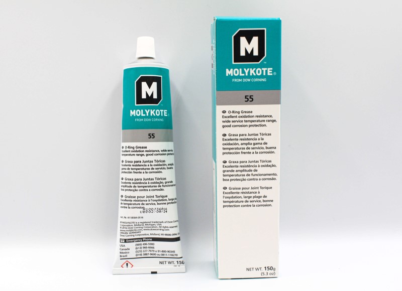 Molykote® 55 O-Ring Grease Provides dynamic lubrication between rubber and metal parts, especially in pneumatic systems. Slightly swells O-rings to provide a tight seal, has a broad service temperature range and resists oxidation. Use for lubricating O-rings, sealing pneumatic systems and in aircraft applications. *Not recommended for lubricating silicone rubber O-rings and seals. Test before use on plastics; may attack polycarbonate and other plastics. Not designed for lubricating bearings.